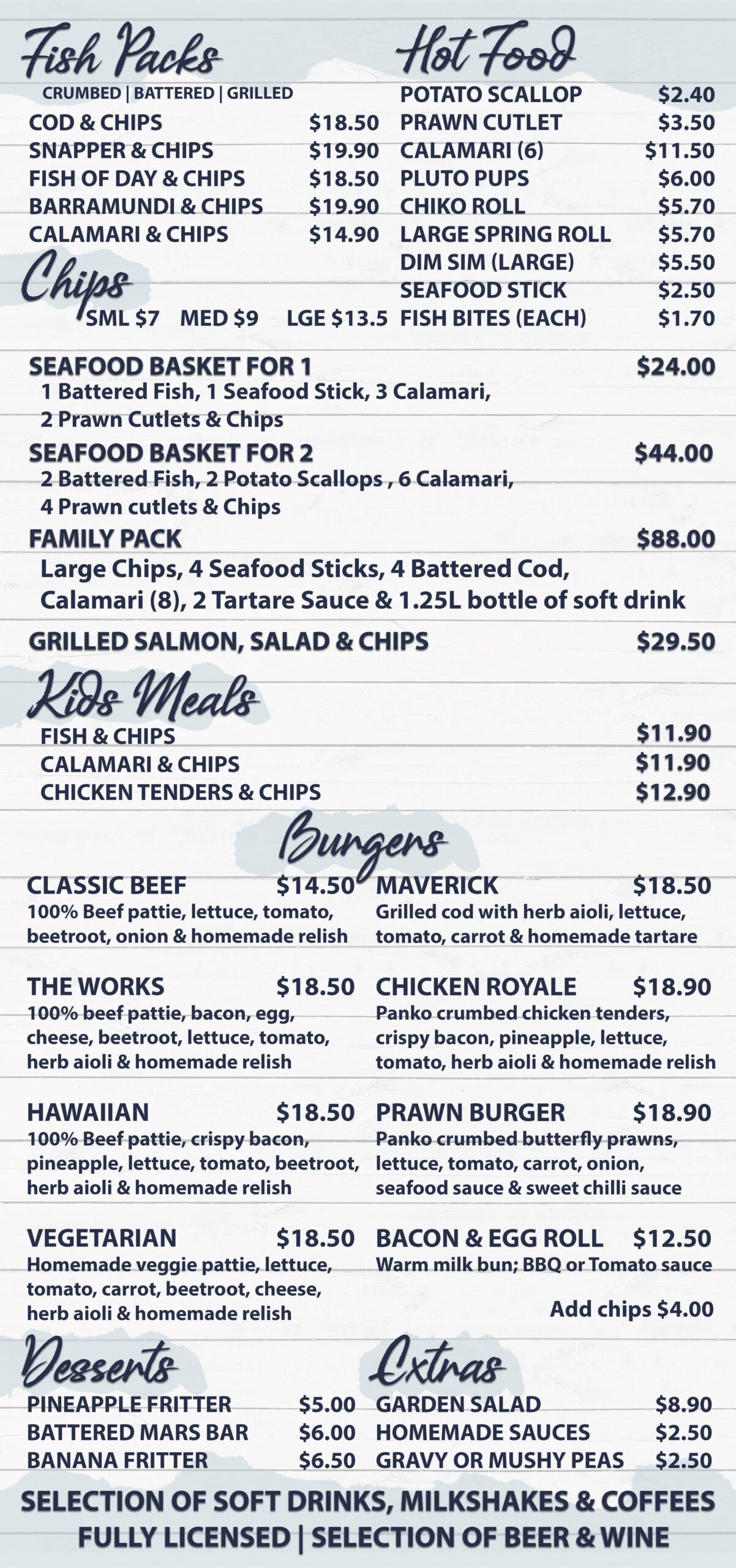 Seating available on the rear deck overlooking the park or treat yourself to takeaway, perfect for a picnic or on cooler nights for a fish n chip feed at home.